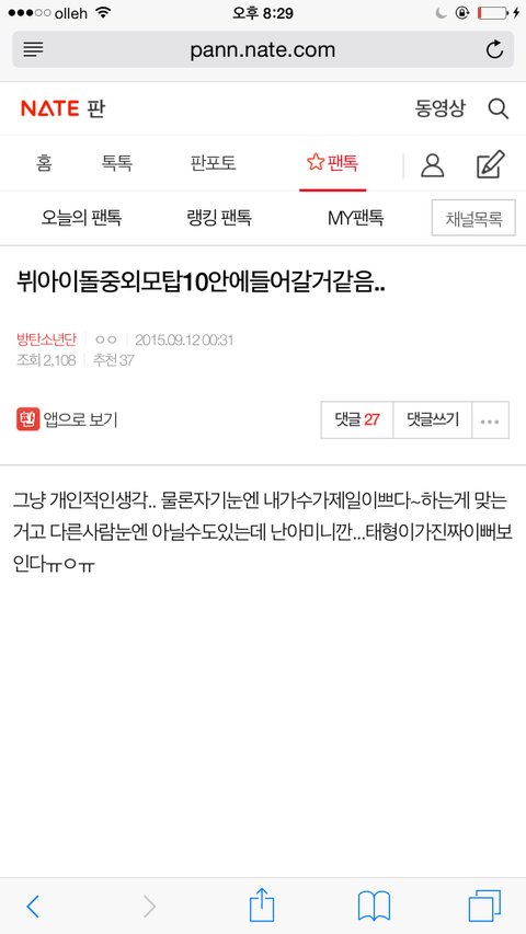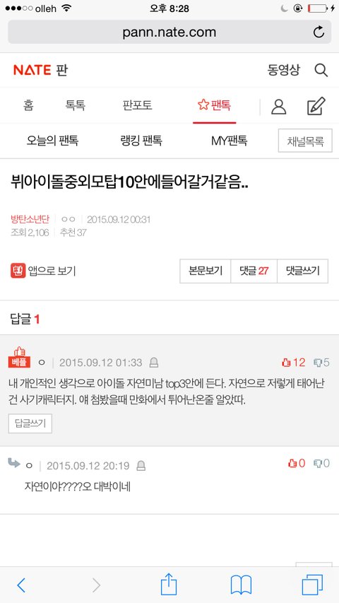 여기서 말하면 욕먹을거 아니까 팬톡에서 한건데 왜 니네가 친절히 캡쳐까지 해주셔서 ㅈㄹ을 하세요? 아미들 한텐 잘생겼으니까 팬톡으로 갔지... 팬톡으로 안가도 욕먹고 안가도 욕먹고 그냥 글쓰지말고 네이트판 망해라 아딴식으로 아이돌 까는데 네이트판 쓸꺼면 때려쳐