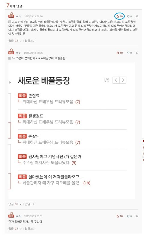 원래 베플 3개일때 첫번째 베플이 조작하는 알바가 디오팬이라는 댓글임