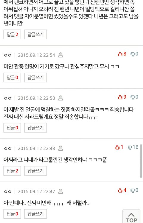 방탄이라고 치기만해도 팬코하는 아미가 솔직히 방탄이 빅뱅바른다부터시작해서 자꾸다른가수 까내리면서방탄칭찬하는데..그거진짜미안해 그냥 지나쳐줘....