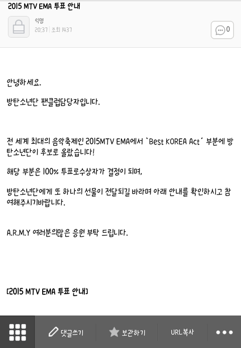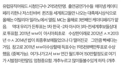 그냥 링크타고 투표클릭해주면 완료~~여러번 계속 투표할 수도 있어! 어때 쉽지? 나 하나쯤 생각하지말고 한번이라도 좋으니까 투표열심히 해서 애들 상타게해주자
