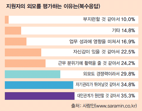 남잔데 대기업 면접 몇군데 가봤는데 가는곳마다 인사과 여직원들 진짜 엄청 이쁘더라.. 남자들도 인상 좋고 덩치도 좋고, 특히 여자들이 외모에 따라 대접이 많이 다른것 같긴함.