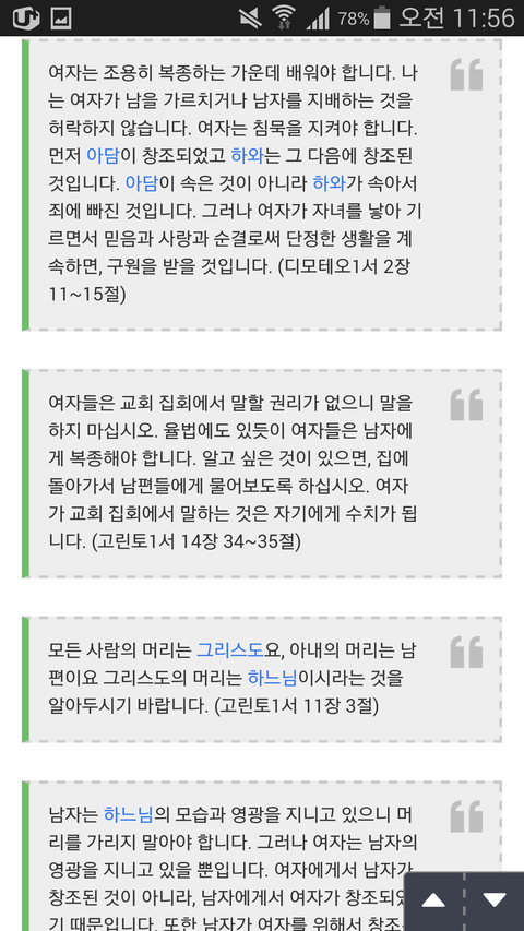 그런데 교회에선 이런 주제로 설교를 하진 않지? 성차별적인 설교를 하면 여자들이 교회 안오고 그럼 돈벌이가 안돼니까. 근데 동성애자들은 미친듯이 까잖아? 뭔가 너무 역겹지 않아? 일관성이 없는거. 여성성차별도 분명히 성경말씀인데 이젠 그건 안돼겠고, 그나마 쪽수도 적고 만만한 동성애자들은 미친듯이 까야겠고..