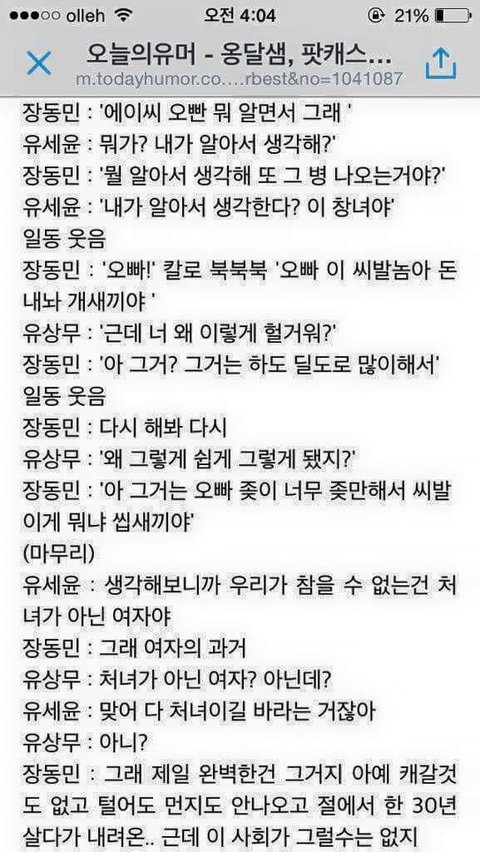 난 무한도전 장동민 지지자였음 근데 옹꾸라 어쩌고 내용이 여자는 콘돔끼고 ㅅㅅ하면 창녀,딜도많이해서 거기 넓어 졌다 여자는 남자한태 머리가 안된다는둥 솔직히 이게 쉴드쳐주고 갓동민갓동민 할 내용임?? 그럼 이도경은? 남자키 루저한번 했다고 아직까지도 캡쳐뜨고 남자한태 욕먹는 이도경도 용서좀해줘요 남자 여자 편가르는건 아니지만 확실히 남자들이 더 사건터져도 복귀가 빠른건 사실임 뭐 그런것 가지고 유난;; 이런분위기도 있고 잘나가던 김옥빈 아직도 남자계산하게하고 적립카드 는 내꺼 냈다는 한마디로 극딜 당하는데;; 장동민이 후배잘챙겨주고 이런건 알겠음 하지만 갓동민은 아니지않나 이 사건 터지기전에는 갓동민 이런거 못들어본것 같은데 유독 이 사건터지고 갓동민bbb이러면서 인성에 관한 캡쳐가 올라온다 어떡하라고 저렇게 인성갓이니까 그깟 여자비하가 대수인가 뭐 이런건가