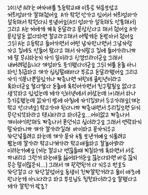 그리고 아빠가 화장품 사라고 카드 줬는데 걔가 자기것좀 사달라해서 두개 아빠몰래 사줬는데 후회 되네요 옷도 사달라고해서 엄마가 시내에서 옷사라고 준카드로 옷 몰래사서 줫는데 진짜 이것도 다 후회 되네요 케이스도 2개나 사주고 걔가 먹고싶다는거 다 사주고 한번씩 걔 엄마가 돈주는거 말고는 내돈으로 먹고 놀면서 내돈 남은거 자기 돈인것 처럼 2만원 가져가서 내가 갖고있을께 하더니(저한테는 천원짜리 6장인가 7장인가 가져가라하고) 남자친구랑 논다고 돈 다썼다더군요 남자친구가 돈 있냐 해서 2만원있다 내친구 누구누구 돈이다 했더니 걔꺼는 써도 된다고 하면서 쓴것같더라구요(사실인지아닌지는 모르는데 남자친구랑 제돈 쓴건 확실하구요) 그래서 제가 니네 엄마한테 어떻게든 받아서 달라고 장난하냐고 하니까 장난아니래요 자기 엄마가 돈안준대요 ... 후 .... 걔네 엄마가 걔가 저한테 받은돈 때문에 미안해서 먹을거 사주긴했었어요 걔가 걔네 엄마한테 돈받아서 5번 사줬나? 사주고 나머지는 다 그아줌마가 집적 저한테 사준거예요 걔는 자기가 머 잘못했는지도 모릅니다.. 자기 엄마한테도 욕하고 소리지르고 하는데... 그리고 제가알기론 저말고 연락하는 친구 한명밖에 없는걸로 압니다...