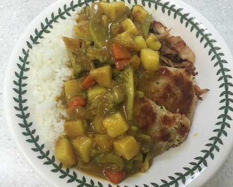 브로콜리,감자,당근,양파 야채만 넣고 끓인 카레에 마트에서산 돈까스 남은치킨 투척!