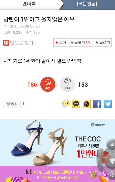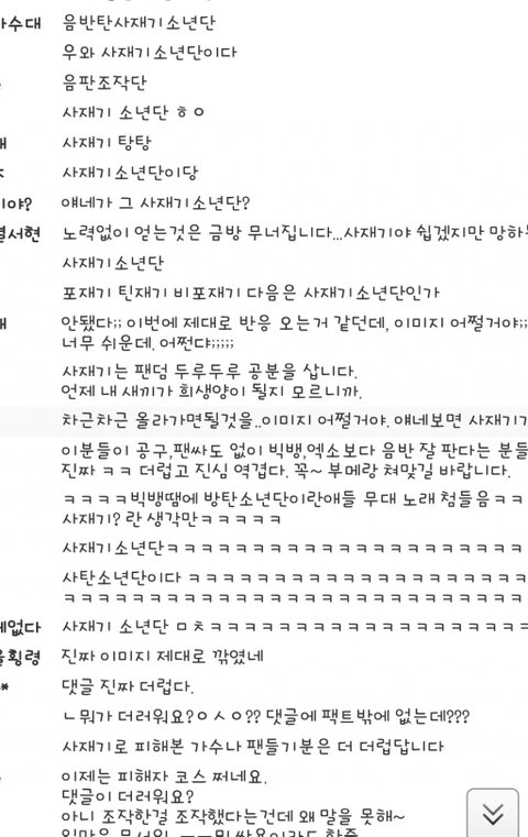 뭐만하면사재기돌이라고하고 지민이다쳤을때도 사재기해서 벌받은거라느니.. 1위했을때도 판에서 오지게까이고ㅋㅋㅋㅋㅋㅋ사재기로1위하먄기분좋냐느니 어쩌냐느니 말도많았고