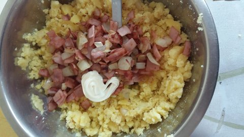 2.감자를 으꺠고, 소금,후추 약간 넣고 마요네즈(또는우유)볶아두었던 재료들을 모두 넣어준다