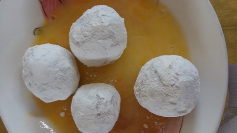 그리고 밀가루->달걀물->빵가루 순으로 추워하는 감자에게 옷을 입혀 줍시다!!