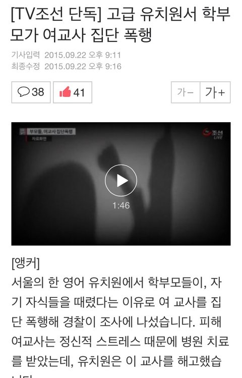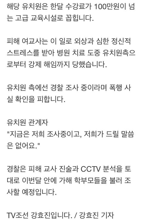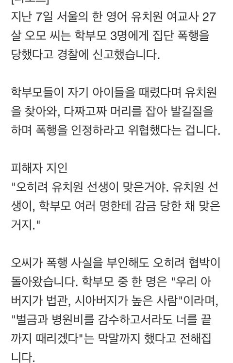 cctv도 제대로 확인하지 않은채 교사가 자신의 아이를 폭행했다는 심증만 가지고 교사 한명을 학부모들이 집단 폭행, 폭언, 감금 했다네요.