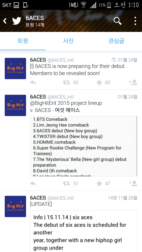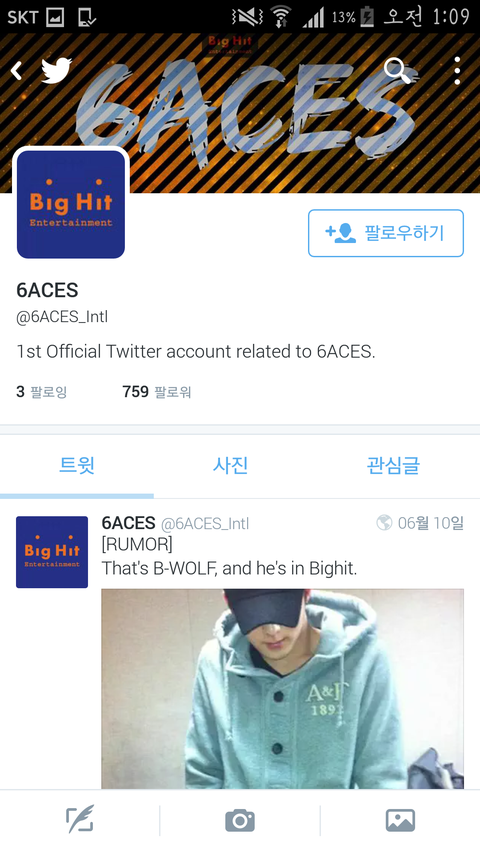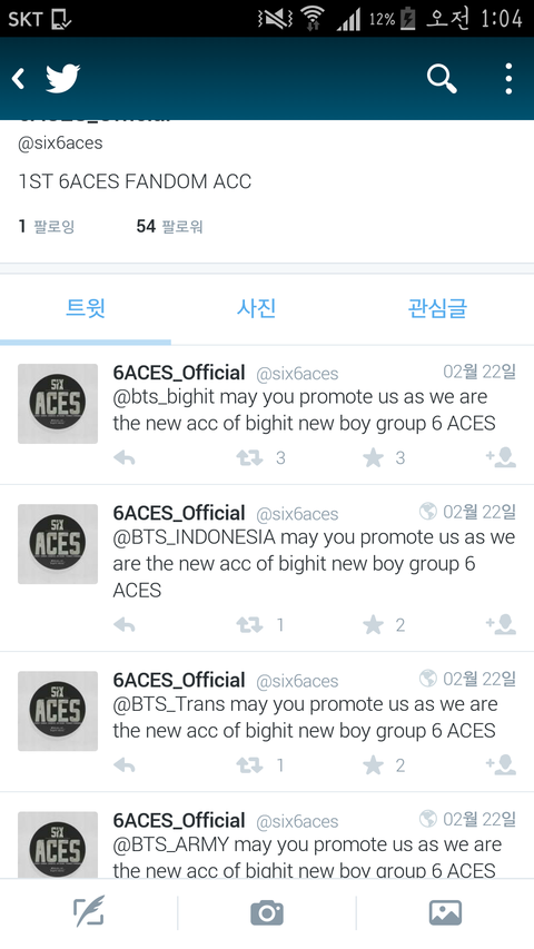 저게 6에이스 계정 중 하난데 빅히트한테 멘션 보내면서 하는 말이 '우리가 빅히트의 새로운 보이 그룹인 6에이스 계정이라는 것을 홍보해주실래요' 이런 내용.. 아 뭔가 앞뒤가 안 맞아..