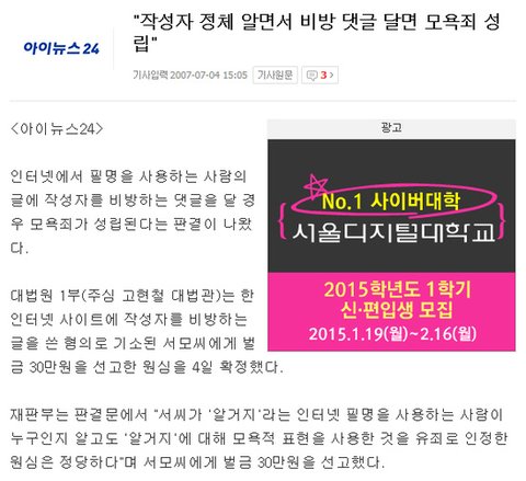 사이버 명예훼손죄은 여러모로 참 X 같은 법이라 할 수 있는데, 죄명은 사이버 명예훼손죄인 주제에 웃기게도 여러 분이 아시는 것과 달리 인터넷에서 그냥 다른 사람의 ID나 닉네임을 언급하며 비하하는 하는 걸로는 공연성이 있어도 성립되기 힘듭니다. 전자는 ID와 그 사람의 개인정보가 연동되는 경우가 아니고선 다른 사람들이 그 사람이 누구인지 알 수 없기 때문이며, 후자는 닉네임이 같은 사람이 여럿 있을 경우 가해자 측에서 빠져나갈 구멍이 있기 때문입니다. 즉, 이름만 사이버 명예훼손인 이 허점투성이 죄가 완벽히 성립되기 위해선 사람들이 A라는 가해자가 비하 하는 대상인 B라는 사람의 정체를 알 수 있어야 합니다. 이름에 사이버가 들어가는 주제에 다른 사람들이 피해자 사람의 신상을 알아야 피해자가 가해자를 처벌할 수 있다는 이야기입니다. 여러모로 피해자보단 가해자에게 유리합니다.