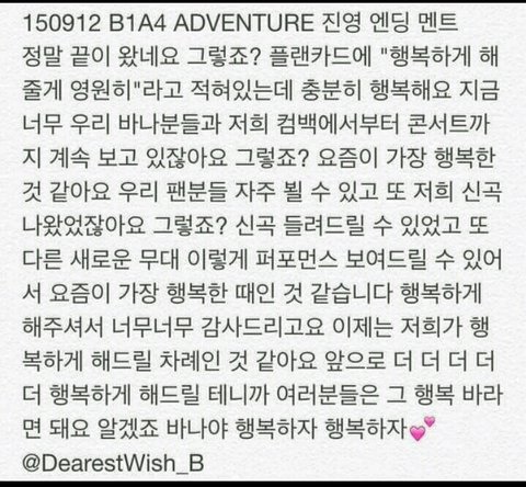 B1A4가 바나 너무 아껴주는것같아ㅠㅠㅠ 난 타팬이고 내 친구가 바난데 가끔씩 비포자랑하는거 보면 너무 부러워ㅠㅠㅠ 서로 사이도 좋고.. 우리팬덤도 그랬으면ㅜㅠㅠ