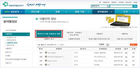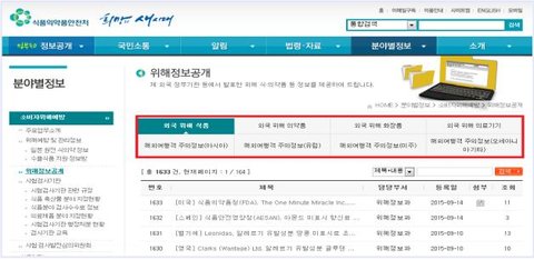 식약처는 허가 받지 않았거나 유해물질이 검출되어 제외국 정부기관 등에서 회수․섭취경고 등의 조치를 취한 식품 정보 및 해외직구식품 유해정보 등 최신 식의약 정보를 상시 제공하고 있는데요.