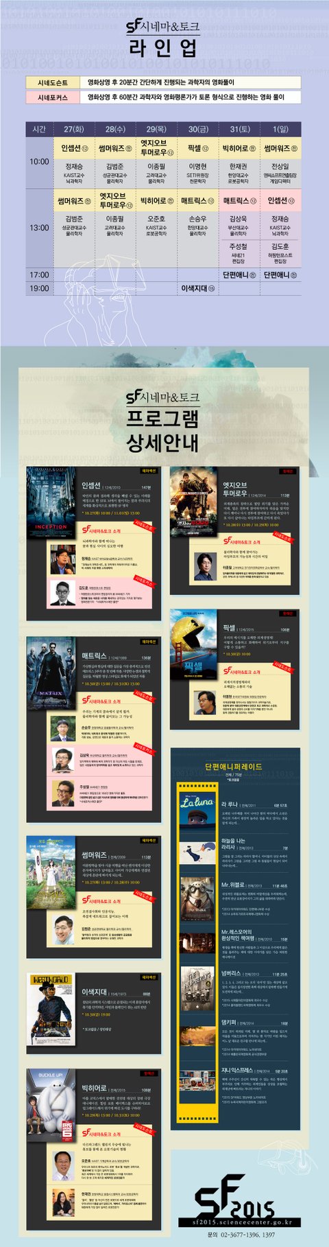 SF2015의 SF시네마&토크 프로그램은 SF영화를 보고 국내 스타 과학자들과 영화에 대한 과학적 궁금증을 풀어보는 시간입니다. 여느 GV와는 다른 느낌을 받으실 수 있을 거예요. 어떤 주제로, 어떤 패널들과 대화를 나눌 수 있을지 공개합니다!!