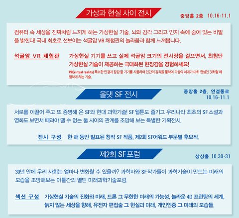 SF2015 주제전 '가상과 현실 사이'에서는 우리 감각의 한계와 오류가 일으키는 현상에 대해 알아보고, 가상현실의 최신기술을 이용하여 석굴암 체험을 할 수 있습니다. 이 외에도 '올댓SF' 전시 프로그램과 과학자와 SF 작가들이 과학기술이 만드는 미래의 모습을 조망해보는 SF포럼 등이 준비되어 있습니다.