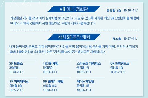 SF 영화 관람과 영화 속 과학토크로 진행되는 SF시네마&토크, 가상과 현실 사이(전시), 올댓SF(전시), SF포럼, SF어워드 등의 프로그램과 착시SF공작체험, VR미니영화관, 나인봇 체험 등 다양한 부대행사로 구성되어 있습니다.