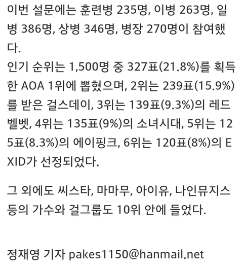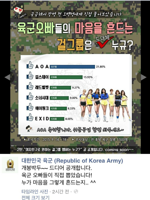"맨처음에 걸그룹중에 6팀투표한다음에 6팀중에서 투표한거" 라는 뜻이셨다네요. 전 후보 6팀뿐이었단 댓글보고 군인분들한테 처음부터 저 6팀밖에 선택권을 안준 거라는 뜻인줄ㅜㅋㅋ(6위=꼴찌란 말로 이해했음.실제로는 전체 걸그룹 중 상위6등)