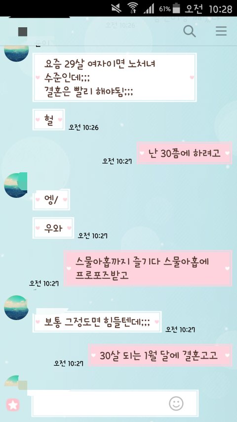 저는 21살 여자입니다. 요즘 썸? 같다고 할수 있는 동갑내기 남사친이랑 이런 저런 이야기를 하고있는데 오늘 아는 언니에 대해 이야기하는 중 갑자기 그 언니는 시집 안가냐고, 여자 나이 29살이면 노처녀라고 막 그러는거에요. 자기는 군대 제대하고 바로 24살이나 25살쯤에 결혼한다나? 제가 외국에 살고 있어서 잘 모를 수도 있으나 요즘 남자나 여자나 대학졸업하고 취업해서 결혼자금 모으고 안정적이 되어서 결혼하면 보통 여자는 20대 후반에서 30대 초반, 남자는 30대 초반에서 중반으로 알고있거든요. 제 사촌언니도 29살에 결혼했고, 저 아는 분들도 29에서 33살 사이에 결혼했구요. 제가 저는 결혼을 30살쯤에 하고싶다니까 그때되면 힘들다면서 막 그러는데기분이 나쁘더라고요. 지금 계속 노처녀 노처녀 거리는데 어떻게 반박을 해야 얘가 찍소리도 못할까요? 얘도 24살에 결혼한다는거 보면 아직 철이없는것 같기도 하고.. 조언좀 해주세요 ㅠㅠ 톡내용 첨부합니다