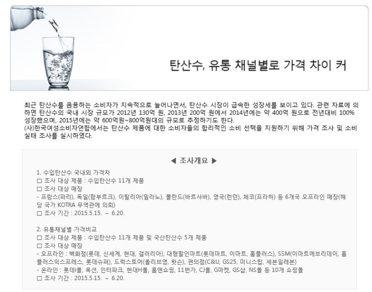 □ 시판 탄산수는 브랜드에 따라 가격 차이가 크게 나타나지만, 원재료와 영양성분에 대한 분석 결과 제품 간의 맛이나 효능의 차이를 가져올 만한 차별적인 요소가 확인되지 않았다. 블라인드 테스트에서도 소비자들은 탄산수 제품의 맛 구분에 어려움을 보였다. 맛이나 영양성분에 있어서 차별적인 요소가 크지 않다면 소비자들은 제품 선택에 있어 광고나 브랜드 이미지 등에 크게 좌우될 수밖에 없으므로 합리적이고 깐깐한 소비 행태가 요구된다.