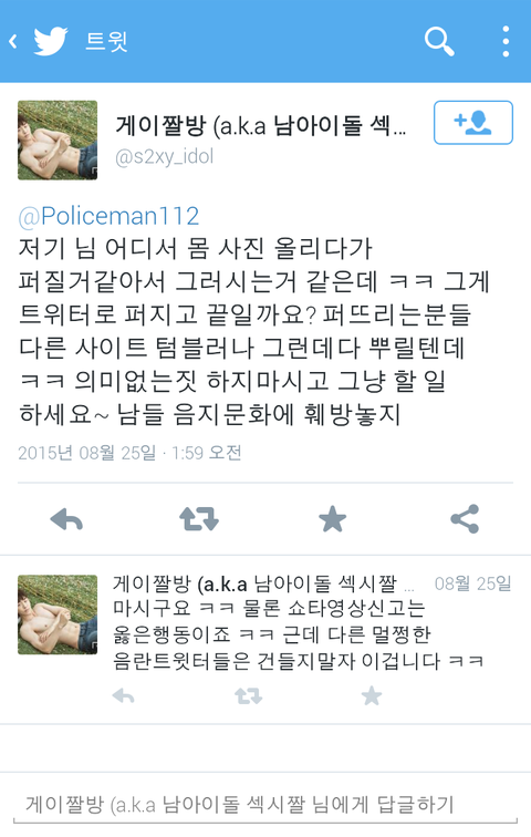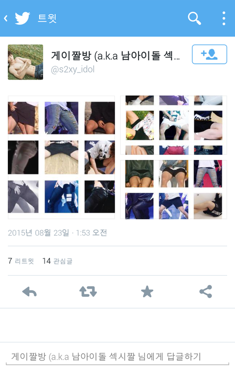 이런글 엄청많은데 트위터면 애들도 트위터하니까 돌아다니다 볼수도잇고.. 왜냐하면 내가 이 계정을 엄청쉽개찾았거든 트위터에 남아 라고만 쳐도 맨위에뜨고..