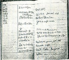운항승무원중 사무장보조 쓰시마유미코(対馬 祐三子 당시 29세)가 불시착에 대비해 남겼던 메모.