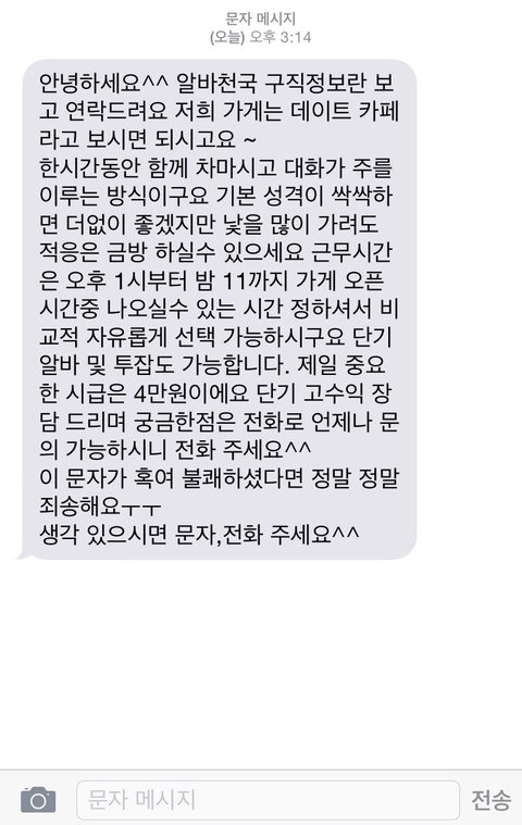 내 친구도 잡이 좀 어려워서 알바 구하는대 저런 문자 왔는데 나이제한 없대서 거기 찾아가 보니까 무슨 안마방 같은데 분위기 이상하고 꺼림칙래서 나가려고 하나까 거기 주인 아저씨가 문 닫고 문 막은 다음에 못나가게 했데 밖에서 기다리고 있던 친구가 문열어줘서 나왔다던데 저런거 진짜 가지마