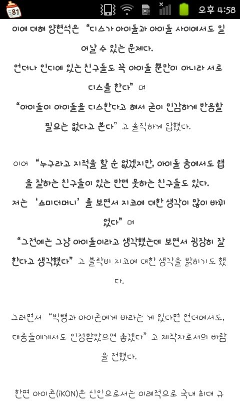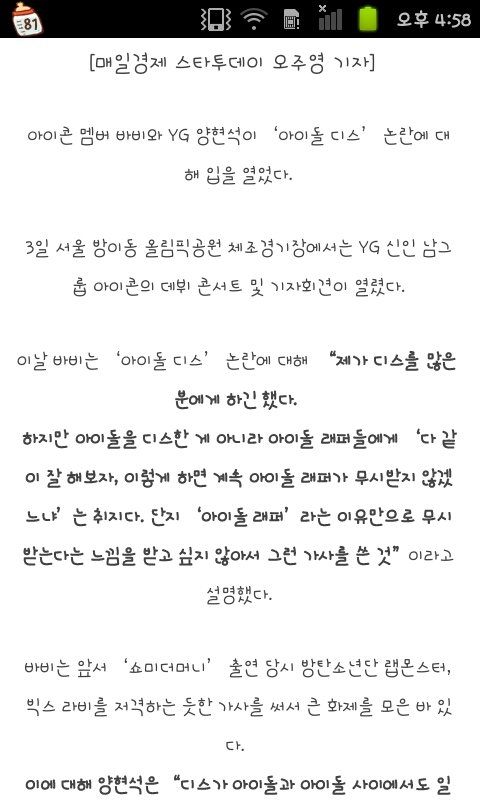 그게 어딜봐서 디스냐 다같이 잘하자는 얘기다. 저도 아이돌이다. 아이콘도 아이돌그룹이 맞다”며 “제가 아이돌을 디스를 했지만, 그 아이돌그룹을 디스한 게 아니라 그 안에서 래퍼를 담당하는 분들에게 ‘다 같이 잘해보자 이렇게 하면 아이돌 래퍼가 무시받는다’는 얘기를 하고 싶었다