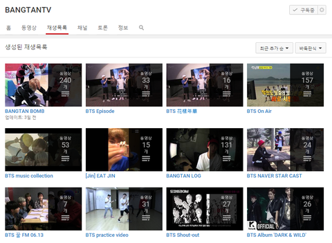 일단 뮤비랑 자켓촬영 끝나고 올려주는 에피소드. 후속곡까지 빠짐없이 해줌. 씹덕인 방탄이들을 간접체험하는 방탄밤과 후속곡,트레일러,가요대전때 일회적으로 한 안무들까지 싹다 올려주는 안무영상, 로그, 앨범리뷰, 잇진, 연습영상, 커버곡 등등 볼게 너무 많음