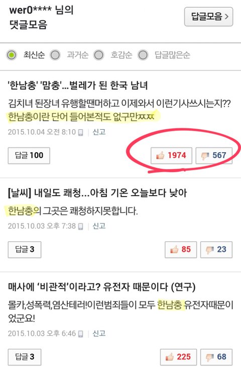 한남충이라는 단어를 들어본 적도 없다는 메갈리아 여성 회원의 댓글 목록.