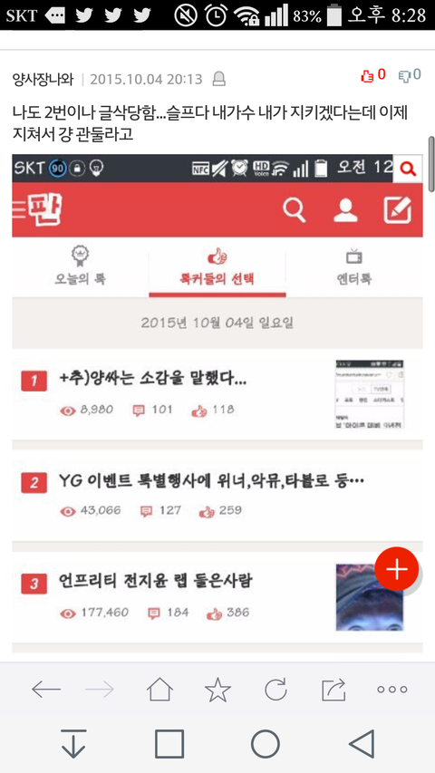 톡선에 있었던 양싸는 소감을 말했다 삭제당했다고 함. 글쓴이는 자삭한거 아니라고 신고가 들어왔거나 해서 삭제당한것 같대