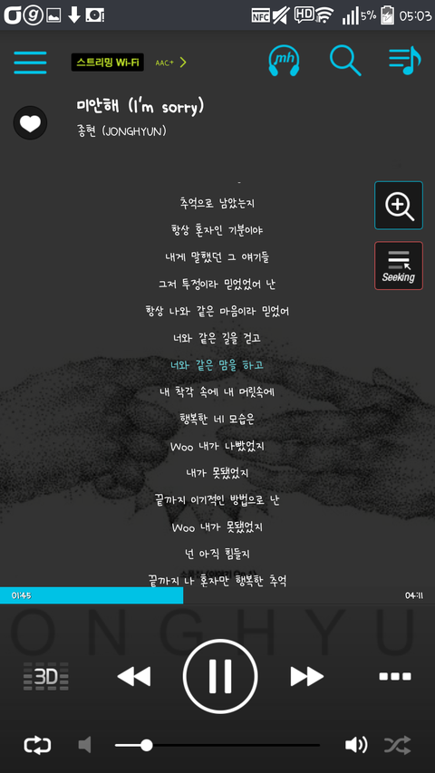 미안해.. 이 노해 듣고 진짜 넋 놓고 있다가 운 것 같음. 진짜 내가 예전에 사람한테 잘못한 일 생각나고 누가 나한테 잘못한 일 생각나서 울컥했던 것 같음. 그 사람한테 받아야 할 사과를 노래로 위로 받고, 이해 받고, 사과 받은 기분? 기분 나쁜 일 있을 때 이 노래 듣고 누워 있으면 진짜 화났던 것도 잔잔해지고 너무 김종현이라는 사람한테 고마워짐. 진짜 이 노래는 극찬을 보내고 싶다. 어떻게 이런 생각을 했을까 싶고, 가사의 '미안해' 한 마디 부를 때마다 진심으로 걱정하고 미안해하는 느낌이라 정말 들을 때마다 너무 사랑스럽고 그런 생각이 듬. 곡 자체의 분위기도 너무 마음에 들고 정말 이 노래 듣고 한동안은 엉엉 운 것 같다. 막 헤어진 연인이나 싸운 친구들 전부에게도 다 잘 어울리는 듯한 노래.. 정말 이 노래 듣고 찬재 같았음. 또 진짜 나를 모를 김종현이라는 가수한테도 너무 고마웠던 노래. 나한테 사과해주고 이해해주는 느낌이라서..