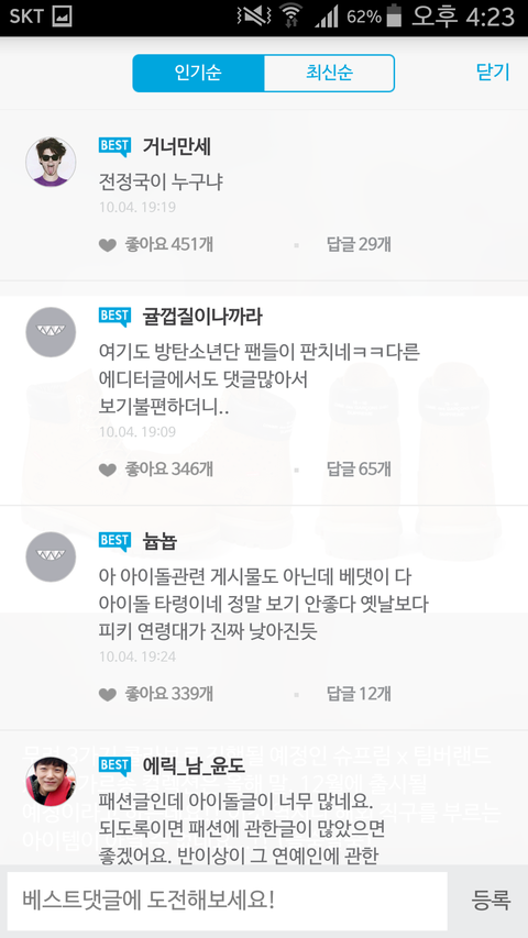 방탄이랑 관련없는 글에는 방탄 댓글 다는 거 자제하자 피키는 아이돌 팬들만 하는 게 아니라 20대들도 하는 거니까 괜히 언급했다가 욕만 먹어