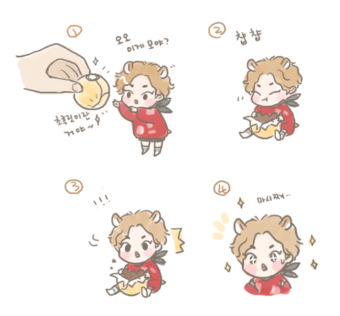 밑에 웅녀가 가져온 회지 번역 글 보고 생각나서 올리는 애셔님 팬아트! 달콤한 초콜릿 맛에 완전 반한 슈햄찌의 표정이 너무 귀엽네 ㅋㅋㅋㅋ 나도 민석이한테 맛나고 이쁜 초콜릿 만들어 주고 싶똬!!! 출처는 애셔님 트윗이야!