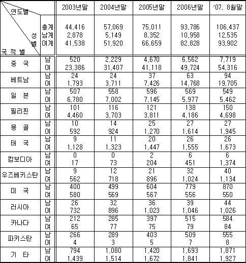 위 표에서 알수 있듯이 2007년의 경우 8월말까지 500명 이상의 파키스탄과 방글라데시 외국인 노동자들이 한국여성과 결혼햇습니다. 그런데 매스컴 발표에 의하면 그 중에서도 국제결혼한 부부들 가운데 이혼율이 유달리 한국여성과 외국인 남성 가운데 6개월 이내 이혼비중은 파키스탄이 가장 높습니다. 거의 대부분 한국여성들은 이슬람이 어떤 종교인가 파키스탄과 방글라데시 라는 나라가 어떤 나라인가 그리고 파키스탄과 방글라데시에서 여성의 인권은 어떠한가에 대해 아무런 정보도 가지고 있지 않기 때문입니다.