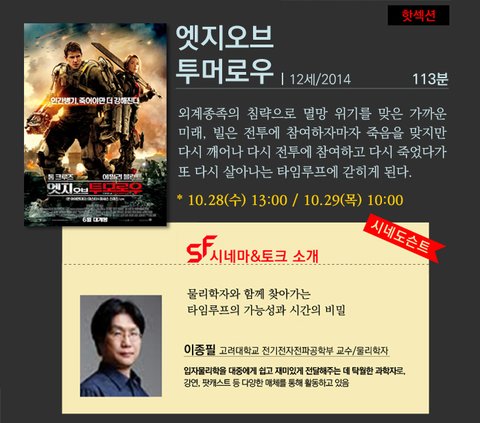 SF영화를 보면서 실제로 과학자들은 어디까지 구현할 수 있을지 궁금했던 적 있으셨을텐데, 과학콘서트 저자 정재승, 휴보아빠 오준호 등 국내 스타과학자들이 들려주는 SF영화 속 과학이야기, SF시네마&토크! 놓치지 마세요~!