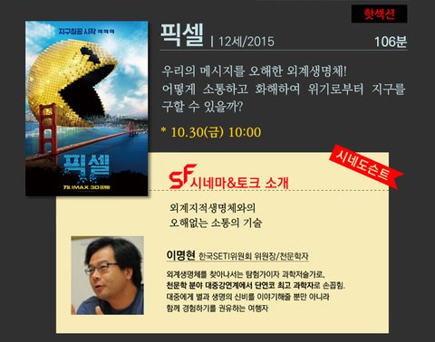 10월 27일(화)부터 11월 1일(일)까지 국립과천과학관에서 열리는 SF2015의 SF시네마&토크 티켓 예매(http://ticket.interpark.com/Ticket/Goods/GoodsInfo.asp?GoodsCode=15010978)가 시작되었습니다.