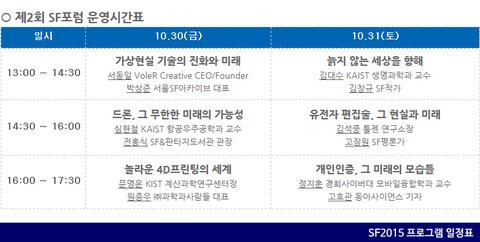 조금 더 SF와 과학에 대한 갈증이 있으시다면, 신청 접수(http://sf2015.sciencecenter.go.kr/allthatsf/read.sf)가 오픈된 제2회 SF포럼에 참여하시는 것도 추천드려요~~~