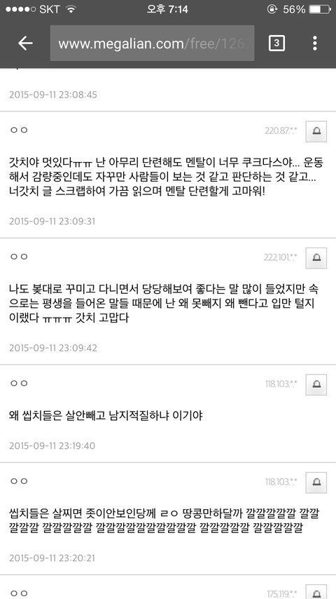 이 분들은 조금 생각이 삐뚤어지신 건지 모르겠지만 상당히 비정상적이더라고요. 게다가 실제 일베나 메갈에서 올라오는 글들을 보면 사회 부적응자나 자기들은 잘난 것도 없으면서 남 깎아내리기만 좋아하는 분들이 조금 많더라고요. 아래 사진 보시면 대충 이해하실 거 같네요.
