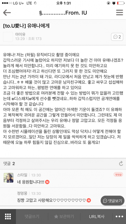 아이유 공홈에 방금 올라왔는데 만난지 2년 가까이 됬다네 대박ㅋㅋㅋㅋ