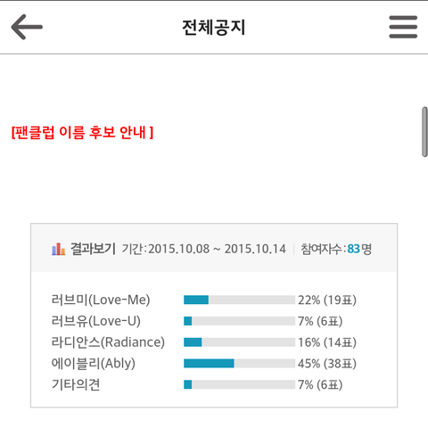 난 라디안스하고 에이블리 맘에 드는데 라디안스투표했어! 에이블리는 타가수 이름이랑 비슷하기도하고 라디안스 뜻이 따스하고 밝은 빛이라 예뻐서
