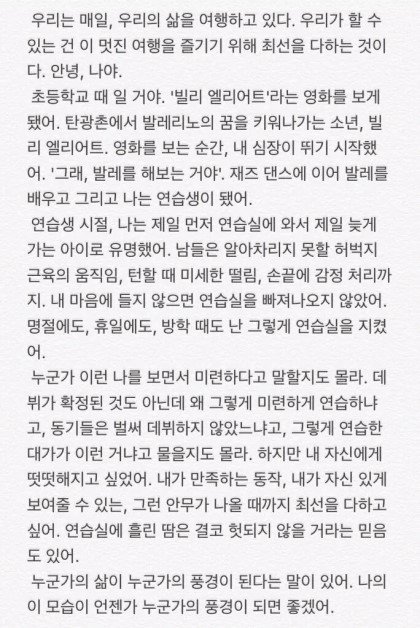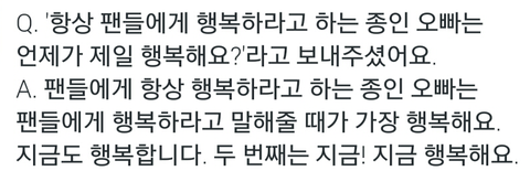 어제 라디오 보고 많이 웃고 종인이 이쁜거 보면서 많이 설레고 좋았어 특히 종인이가 한 말 뭔가 또한번 종인이가 참 속이 깊고 생각의 폭이 넓구나 마냥 아기같은데 생각은 참 어른이다라는 느낌이들더라 멋있어 종인이 멋진 남자야