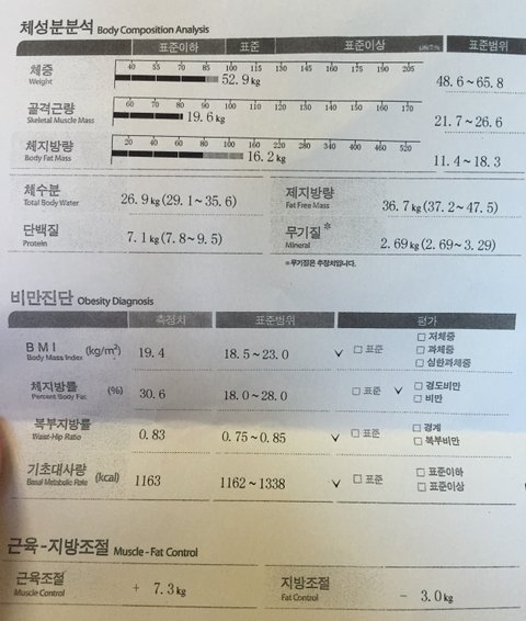 갑자기 살이 7키로가 훅 찌는바람에 (55키로까지 쪗엇습니다...) 한달전부터 운동햇는데 오늘 인바디 측정해보니 겨우 2kg 빠졋더라구요... (53키로) 여전히 체지방률은 경도비만이구요.. (몇일전엔 52-52.5까지 빠졋엇는데...왜더찐건지ㅠㅠ)