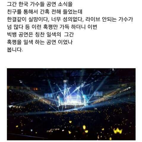 무슨말이 필요해 갓뱅..그나저나 혐석이 빅뱅언플 겁나안해주네 내년이 계약만료던데 빅뱅이 재계약안했니?캐나다 콘서트 40만원짜리 10분만에 매진된거랑 이것좀 언플좀해라ㅠㅠㅠ팬들말고 아무도모름 언플해야할건안하고..이게얼마나 대단한건데