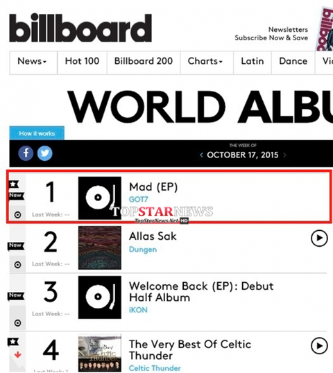 갓세븐(GOT7)의 미니앨범 MAD가 미국 빌보드 월드 앨범 차트 1위에 올랐군요~~~