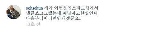 루한 - 세훈과 관련해서 정정하고 싶은 것들이 많이 있다. 루한은 제왑 연습생이 아니었고 또한 그는 2008년에 스엠에 들어왔다. 그는 연습생이 되기 위해 한국에 왔지만 그의 부모님에 의해서 저지당했다. 그의 부모님은 그가 유명해지는 것에 반대했지만 그는 언제나 그의 얼굴을 부모님으로부터 숨겼고,(? 여기서 save가 정확히 뭘 의미하는지 몰라서 내 맘대로 숨기는걸로 의역함.) 부모님은 절대로 그것을 허락하지 않았다. 루한은 나쁜 사람이 아니지만 그의 부모님께 왜 그가 한국으로 오고 싶어하는지 거짓말을 했다. 그게 그가 다시 집으로 호출당한 이유이다. 그는 한국에 연습생이 되어서 2010년에 돌아왔다. 그는 다른 사람들처럼 정기 오디션을 통해서 왔다. 나는 그가 2008년부터 연습생이었다는 것을 보여주는 증거가 있는 것을 알고 있지만 SM 때문에 그가 기다렸다는 것은 사실이 아니다. SM은 연습생이 되기 위해 2년을 기다려 줄 만큼 융통성있지 않다. 만약 당신이 그 당시에 가능하지 않다면 당신은 연습생이 되지 못한다. 루한은 쉭베 친구를 사귀었지만, 한국에서 세훈이나 중국에서 시우민처럼 어려움에 처한 사람들에게 특히 항상 더 잘 해준다. 그는 누군가를 배척하거나 남기고 가는 것을 두고보지 못한다. 루한은 레이랑 친하지만 앞에서 말한 그런 방식은 아니다. 그들은 진짜 형제같다. 루한은 화면에서 보여주진 않지만 정말로 크리스를 존경한다. 여자친구를 사귈 때, 당신은 그의 얼굴을 보면 믿을 수 없겠지만 그는 완전히 여자친구에게 빠진다. 그는 조용하고 차분한 여자를 좋아한다고 말하지만, 내가 본 것에 의하면 완전히 반대다. 그는 여자를 꼬시는 것을 도전으로 여긴다. 그가 코 수술을 한 것은 거의 사실이다. 오, 루한의 얼굴에 있는 상처에 대해서 하나 더 말하고 싶다. 그건 싸움 때문에 생긴거다. 그는 폭력적이지 않지만 작고 쉬운 상대이기 때문에 싸움의 희생자가 된다. 다른 놈들이 의도적으로 루한의 얼굴을 망쳐놓고 싶어하기 때문에 싸움은 매우 차갑다. 그리고 그가 연습생 때 애들을 괴롭히지 않았다는 것은 사실이 아니다.사실 다른 연습생들이 루한을 때때로 괴롭혔다. 그는 많은 것들에 대해 자기 자신을 비난하고 슬퍼한다.