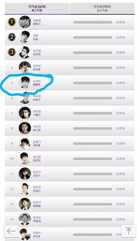 아직은 투표기간 시작 전이라 가나다 순으로 되어있는데, 우리 시작하자마자 1등으로 올려서 상받고 행복해하는 경수모습 됴자기들 다같이보자!!!
