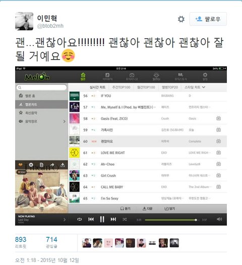 ㅋㅋㅋㅋㅋ 괜찮아요 차트인 되니까 괜찮아요 잘될거야 라고 지랄ㅋㅋㅋㅋㅋㅋ'2위라도 괜찮아요 빠순이들이 올려줄테니까ㅎㅎ 너무 상심하지 말고 닥치고 스밍돌려 빠순아ㅜㅜ우리 1위시켜줘야지' ㅋㅋㅋㅋㅋ