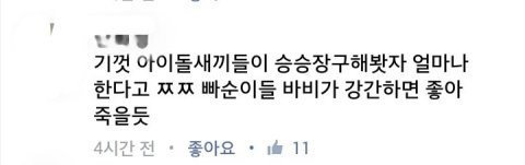 아이콘 말 한마디 가사 한 줄도 미친듯이 논란되는데 정작 누가 바비한테 패드립칠때 저건 좀 심한듯..? 이 정도에서 끝나고 심지어 떳떳하게 베댓도 차지함ㅋㅋㅋㅋㅋ