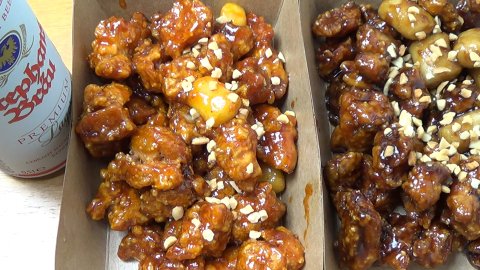 가마로 닭강정은 달콤한 맛과 매콤한 맛 반반으로 샀습니다.
