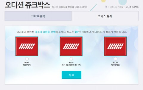 오디션이라는 게임 쥬크박스에 ikon 노래만 투표하게 되어 있네이 중에 취향저격밖에 모르는데 아이콘이 이 정도로 뜸?노래는 좋다고 하는데 리듬게임이라 그런건가;;;투표율 얼마나 나올지 개궁금ㅋㅋㅋ